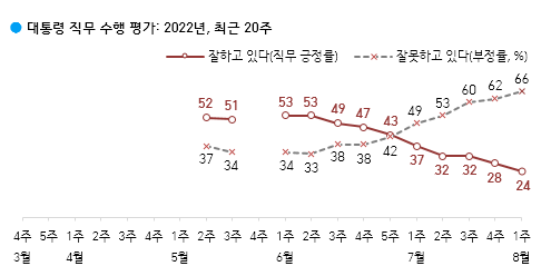 윤 대통령 지지율 24%까지 추락.. 하루전 대통령실 "야당 프레임공격탓"